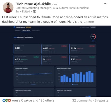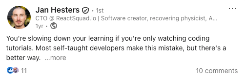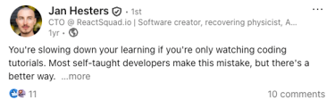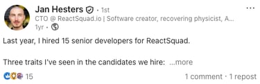 I’ve created witty, engaging and informative content on social media channels like LinkedIn and YouTube for ReactSquad's founder and CTO, Jan Hesters, LinkedIn content for Chore's CEO, Adam Spector, and even LinkedIn content for myself!